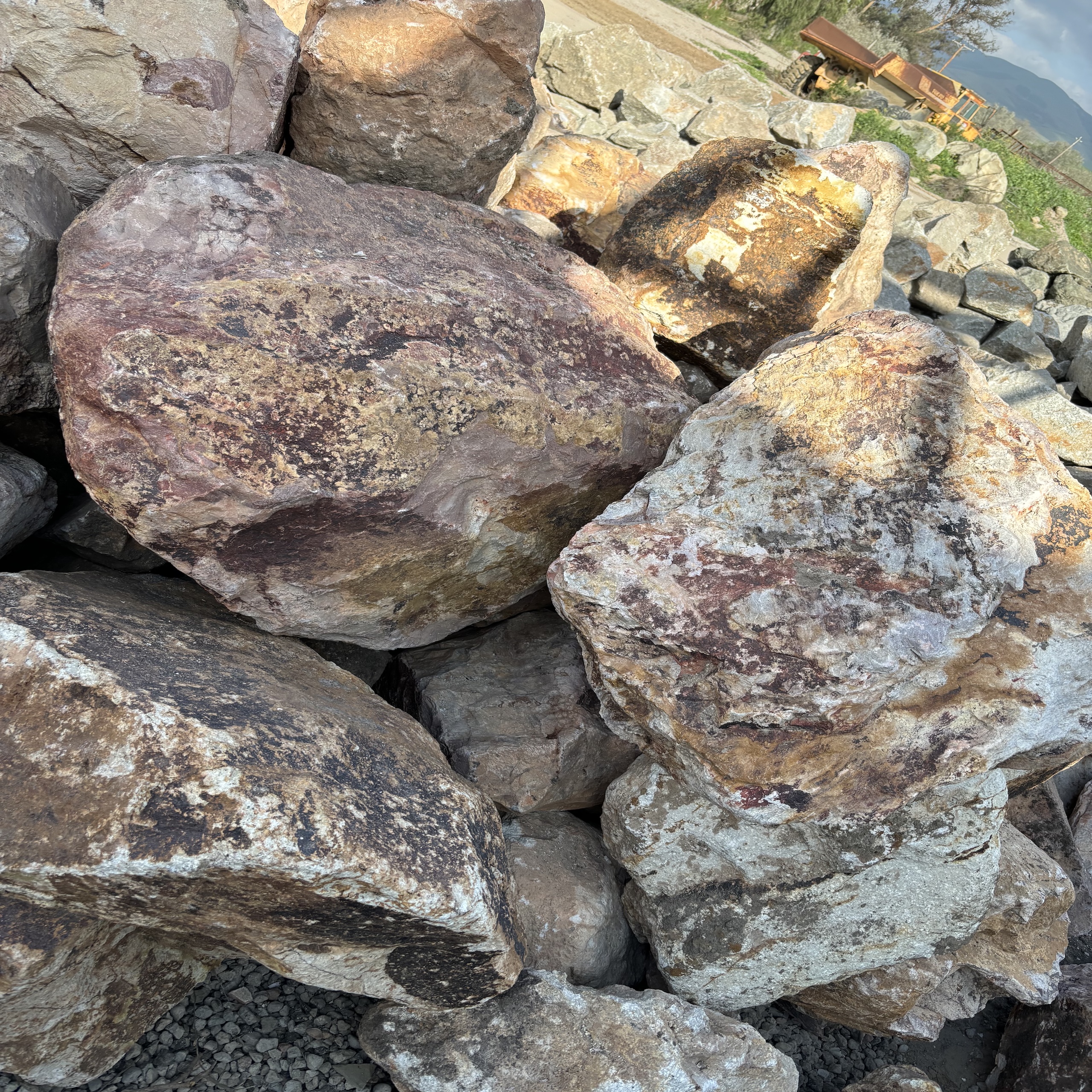 Sydney Peak Boulders are available in a variety of sizes, generally rounded, some boulders have freshly broken faces revealing dramatic veining and colors. Boulders are priced per pound & they are available by the basket.